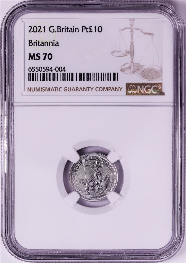 One 2021 Great Britain 10 Pounds Britannia 1/10oz Platinum Coin NGC MS70. NGC Certified.