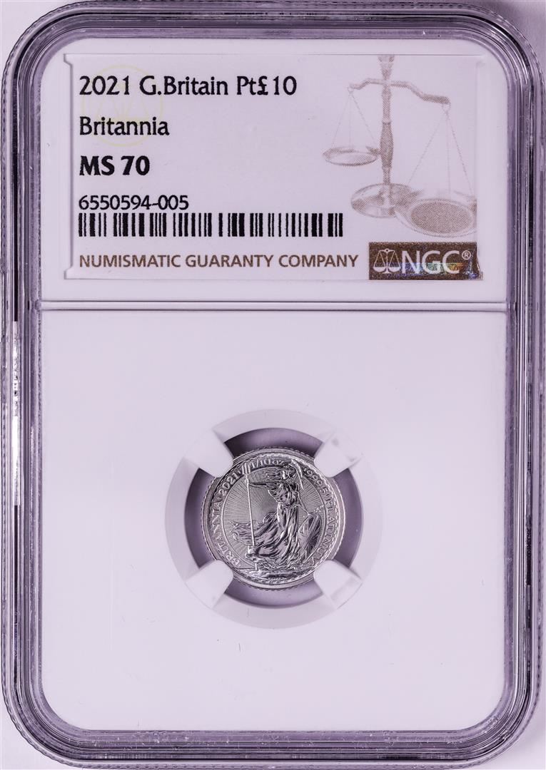 One 2021 Great Britain 10 Pounds Britannia 1/10oz Platinum Coin NGC MS70. NGC Certified.