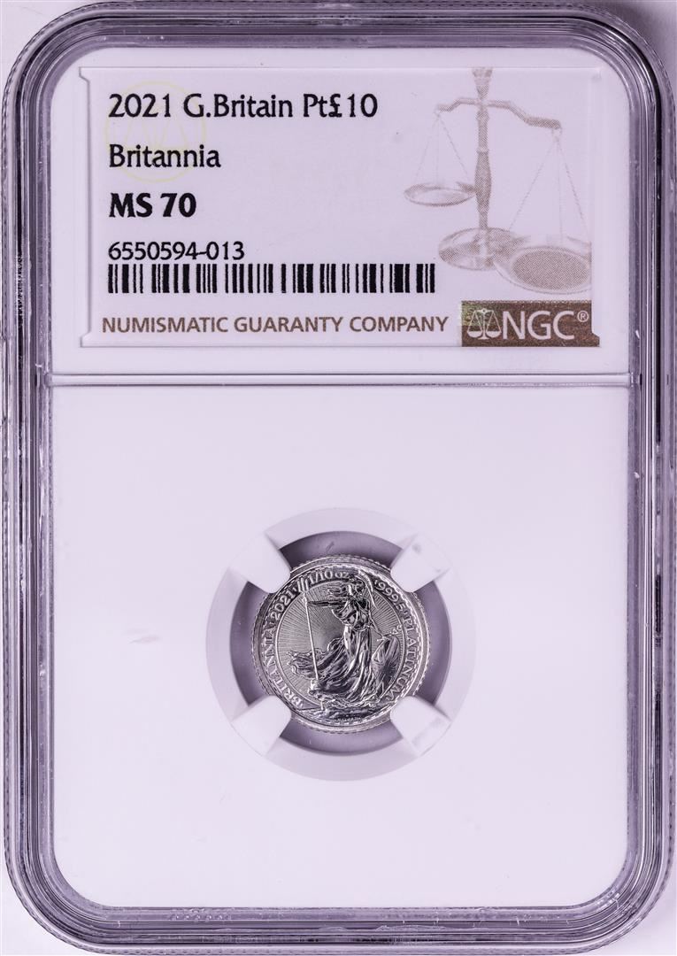 One 2021 Great Britain 10 Pounds Britannia 1/10oz Platinum Coin NGC MS70. NGC Certified.