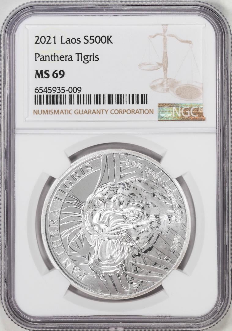 One 2021 Laos 500 Kip Panthera Tigris Silver Coin NGC MS69. NGC Certified.