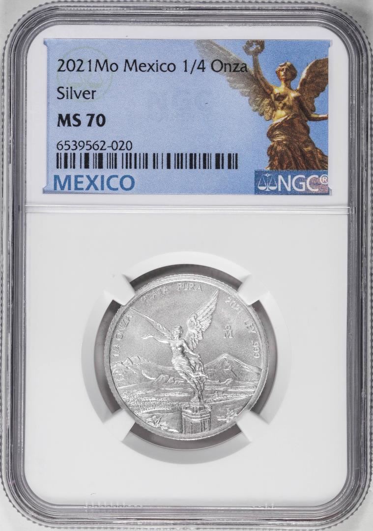 One 2021-Mo Mexico 1/4 oz Silver Libertad Coin NGC MS70. NGC Certified.