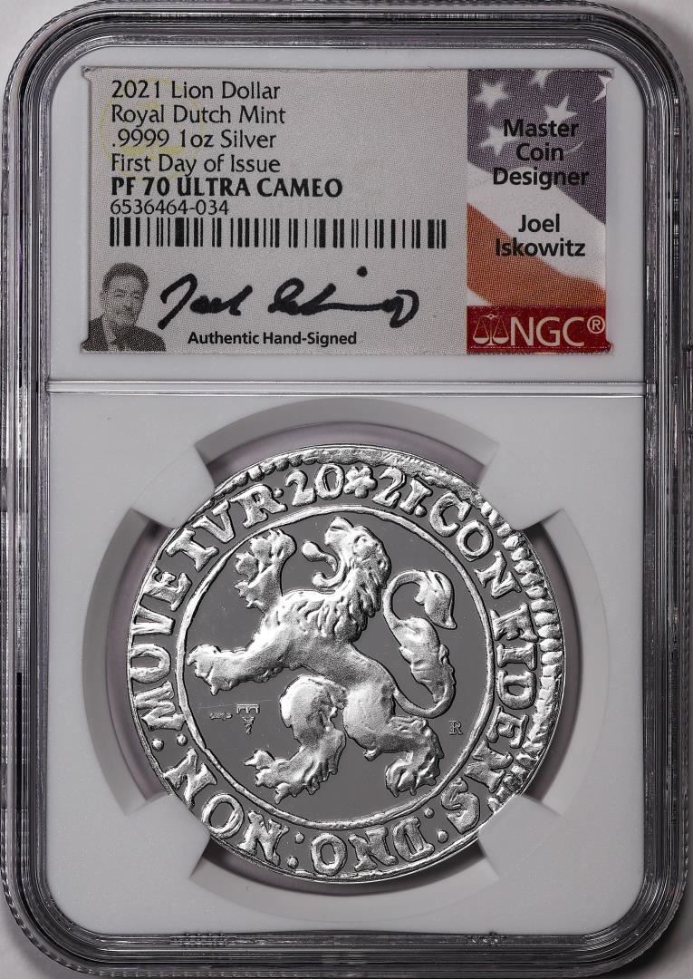 One 2021 Netherlands Proof Lion Dollar Silver Coin NGC PF70 Ultra Cameo FDOI Signed. NGC Certified.