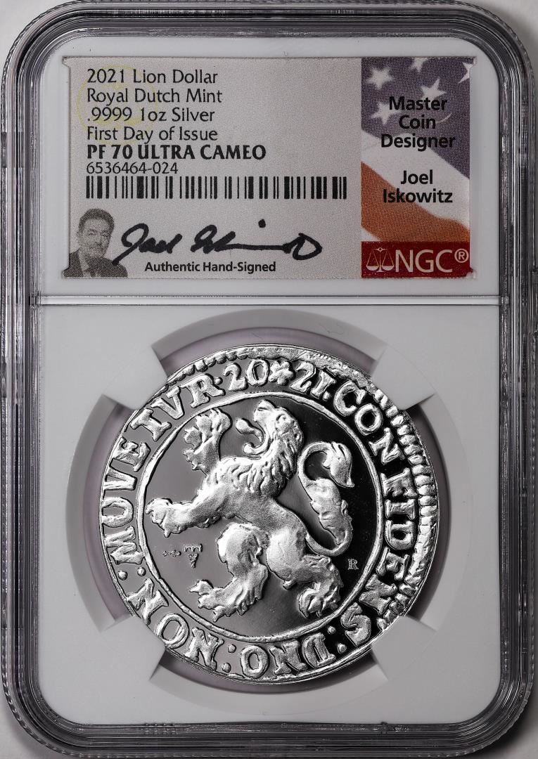 One 2021 Netherlands Proof Lion Dollar Silver Coin NGC PF70 Ultra Cameo FDOI Signed. NGC Certified.