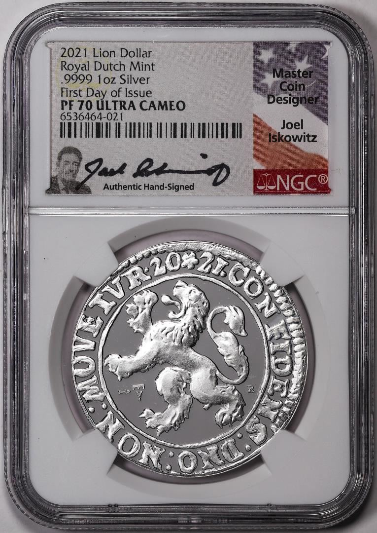 One 2021 Netherlands Proof Lion Dollar Silver Coin NGC PF70 Ultra Cameo FDOI Signed. NGC Certified.