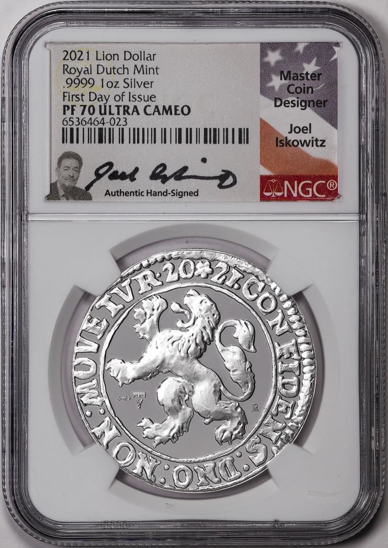 One 2021 Netherlands Proof Lion Dollar Silver Coin NGC PF70 Ultra Cameo FDOI Signed. NGC Certified.