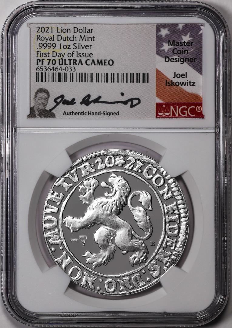 One 2021 Netherlands Proof Lion Dollar Silver Coin NGC PF70 Ultra Cameo FDOI Signed. NGC Certified.