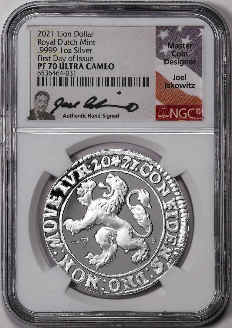 One 2021 Netherlands Proof Lion Dollar Silver Coin NGC PF70 Ultra Cameo FDOI Signed. NGC Certified.