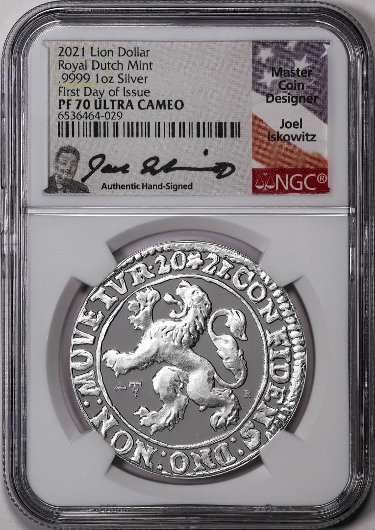 One 2021 Netherlands Proof Lion Dollar Silver Coin NGC PF70 Ultra Cameo FDOI Signed. NGC Certified.