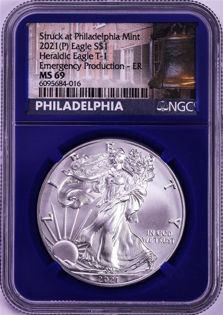 One 2021-(P) Type 1 $1 American Silver Eagle Coin NGC MS69 Early Release Emergency Issue.