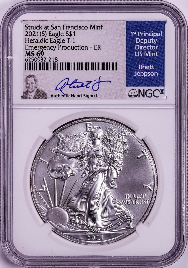 2021(S) Ty. 1 $1 American Silver Eagle Coin NGC MS69 Jeppson Signed Emergency Release