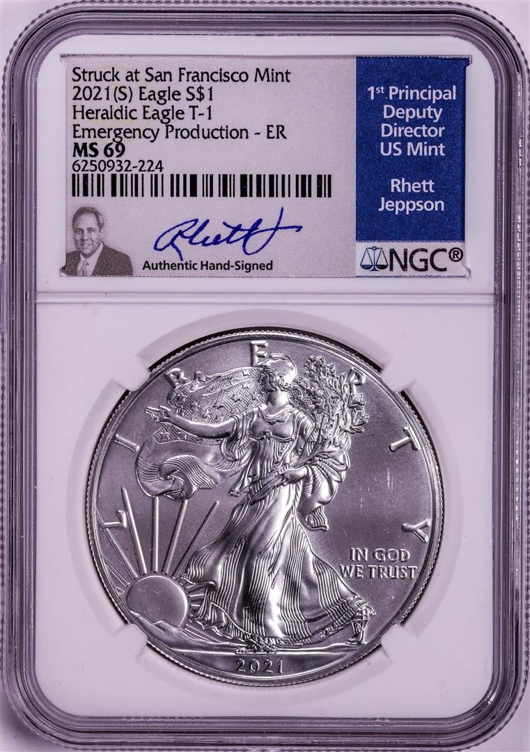 2021(S) Ty. 1 $1 American Silver Eagle Coin NGC MS69 Jeppson Signed Emergency Release