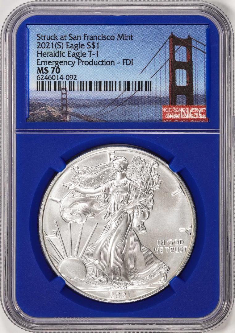 2021(S) Type 1 $1 American Silver Eagle Coin NGC MS70 FDI San Francisco Blue Core
