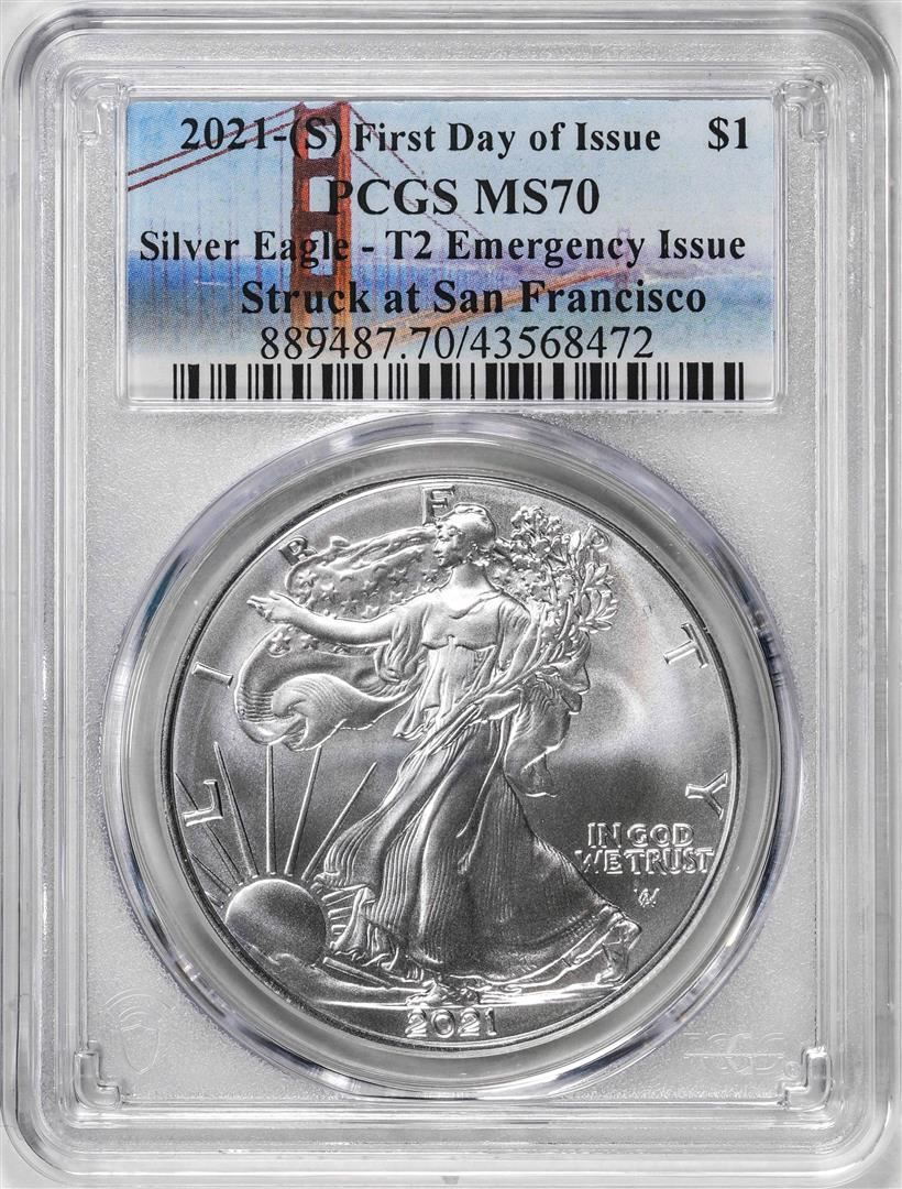 2021-(S) Type 2 $1 American Silver Eagle Coin PCGS MS70 First Day of Issue Emergency