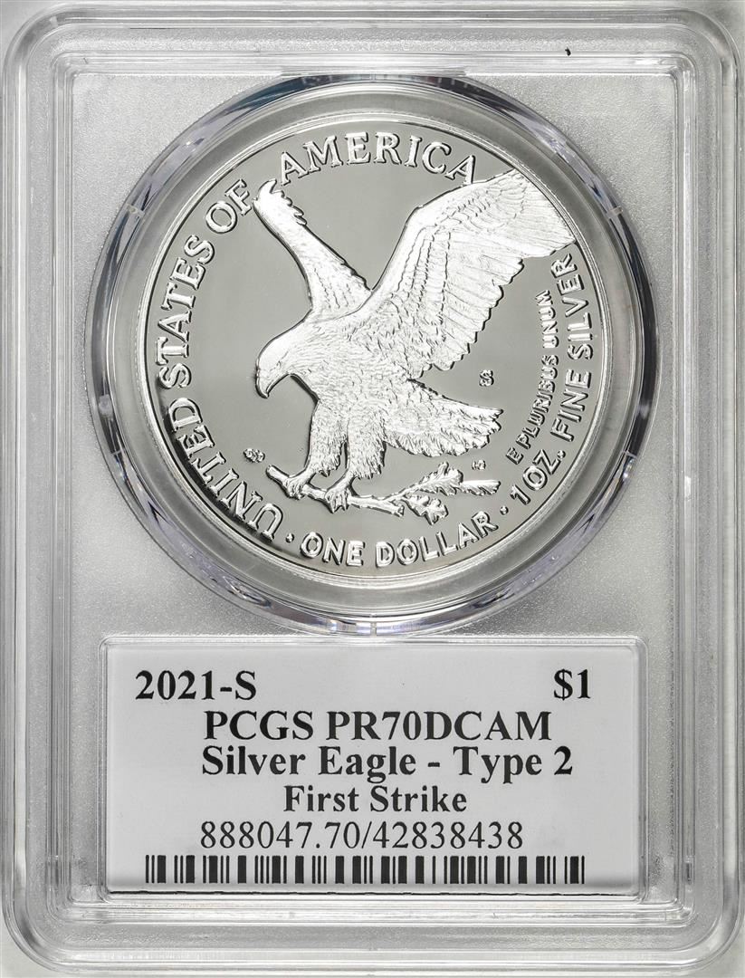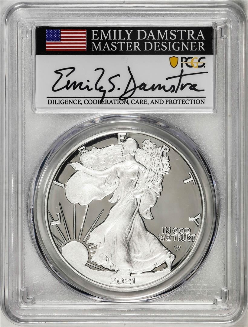 One 2021-S Type 2 $1 American Silver Eagle Coin PCGS PR70DCAM Emily Damstra Signature FS. PCGS Graded.
