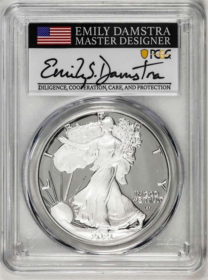 One 2021-S Type 2 $1 American Silver Eagle Coin PCGS PR70DCAM Emily Damstra Signature FS. PCGS Graded.