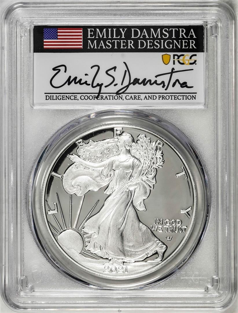 One 2021-S Type 2 $1 American Silver Eagle Coin PCGS PR70DCAM Emily Damstra Signature FS. PCGS Graded.