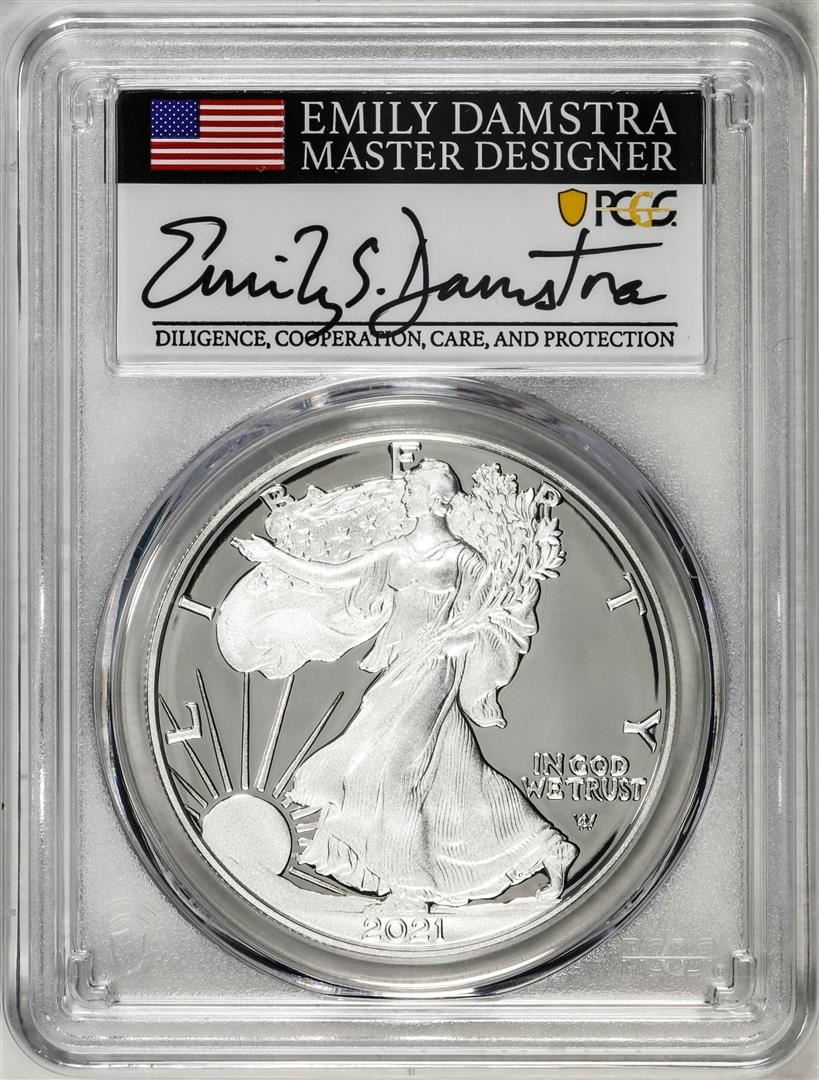 One 2021-S Type 2 $1 American Silver Eagle Coin PCGS PR70DCAM Emily Damstra Signature FS. PCGS Graded.