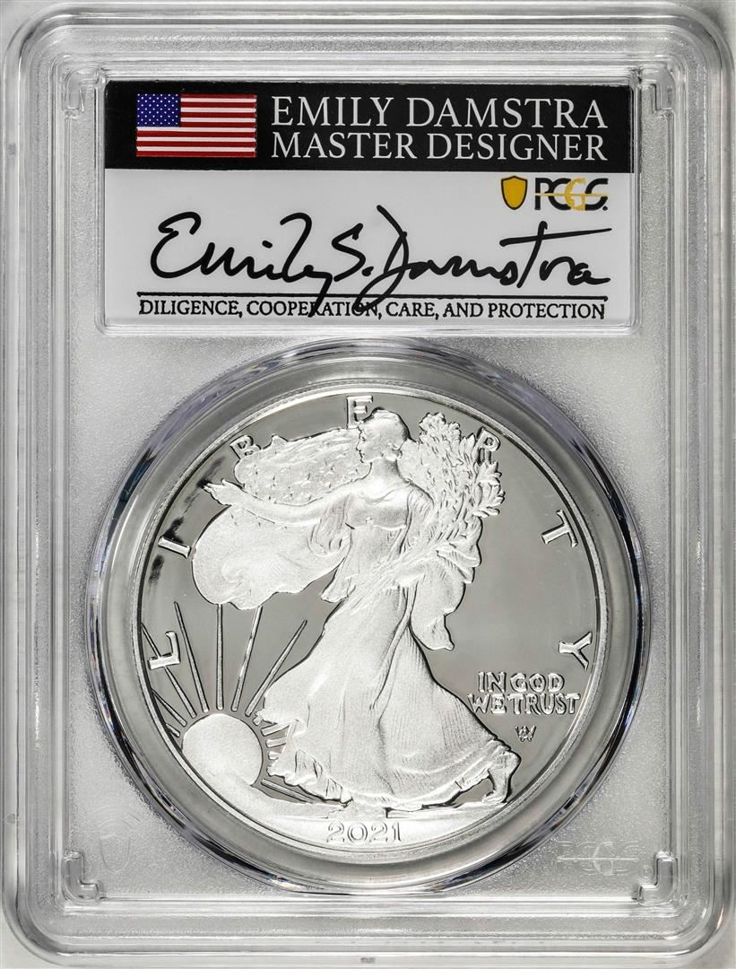 One 2021-S Type 2 $1 American Silver Eagle Coin PCGS PR70DCAM Emily Damstra Signature FS. PCGS Graded.