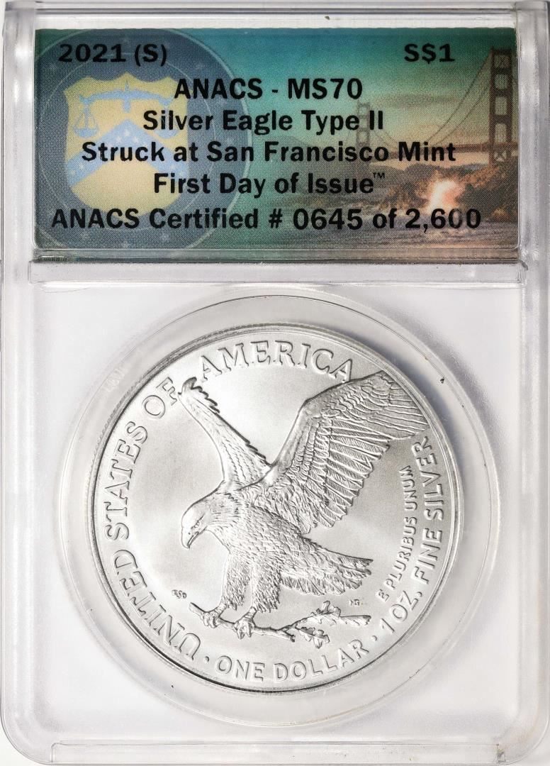 2021-(S) Type II $1 American Silver Eagle Coin ANACS MS70 FDOI San Francisco Mint