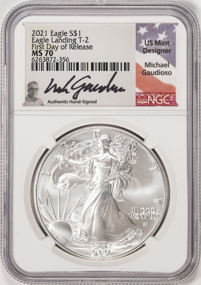 2021 Ty. 2 $1 American Silver Eagle Coin NGC MS70 First Day Release Gaudioso Signed