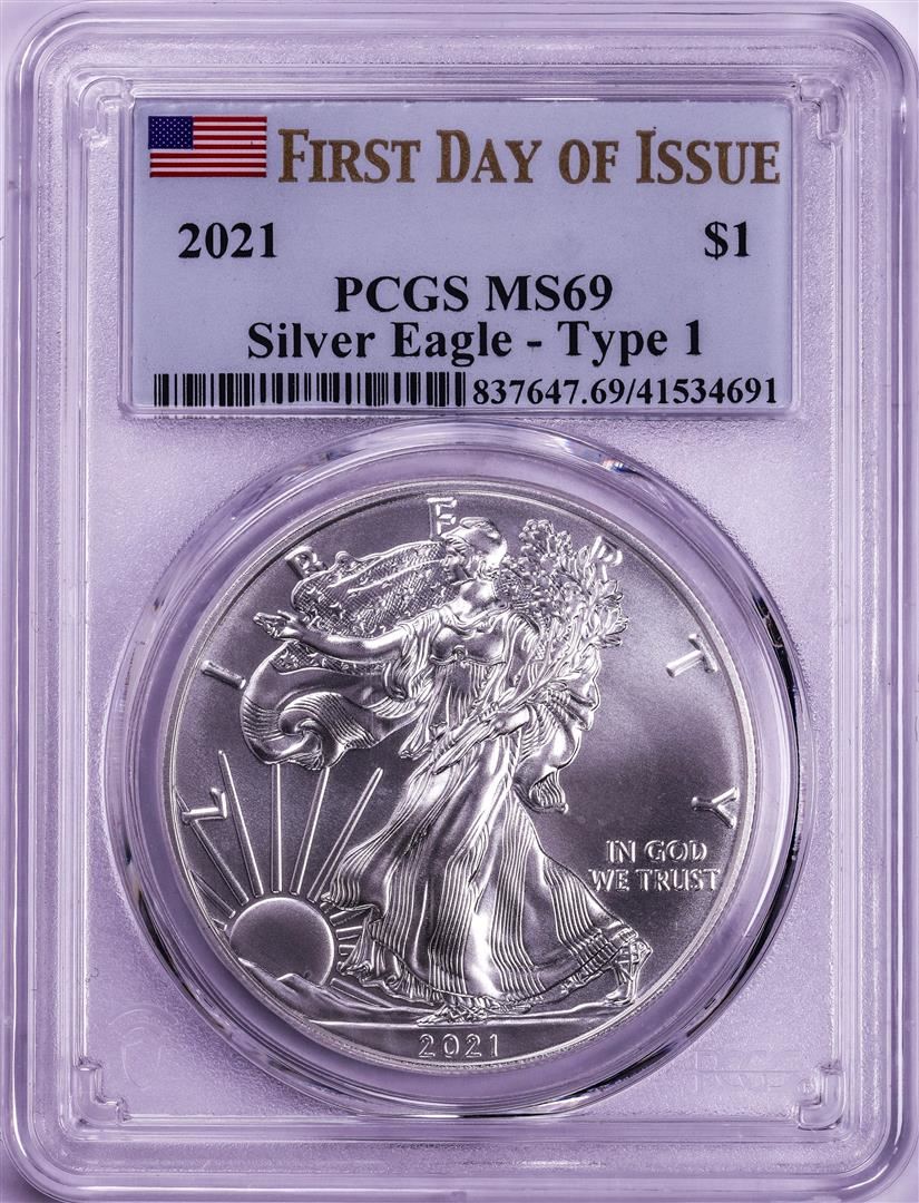 One 2021 Type 1 $1 American Silver Eagle Coin PCGS MS69 First Day of Issue.
