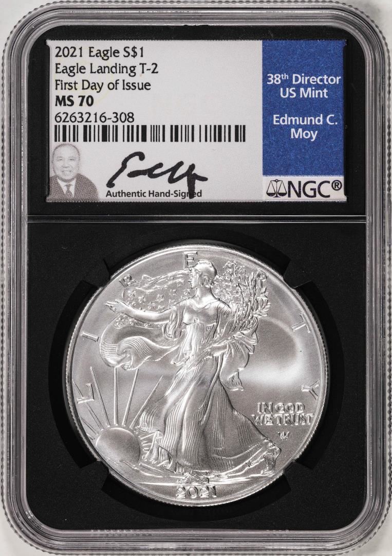 2021 Type 2 $1 American Silver Eagle Coin NGC MS70 FDOI Edmund Moy Signature