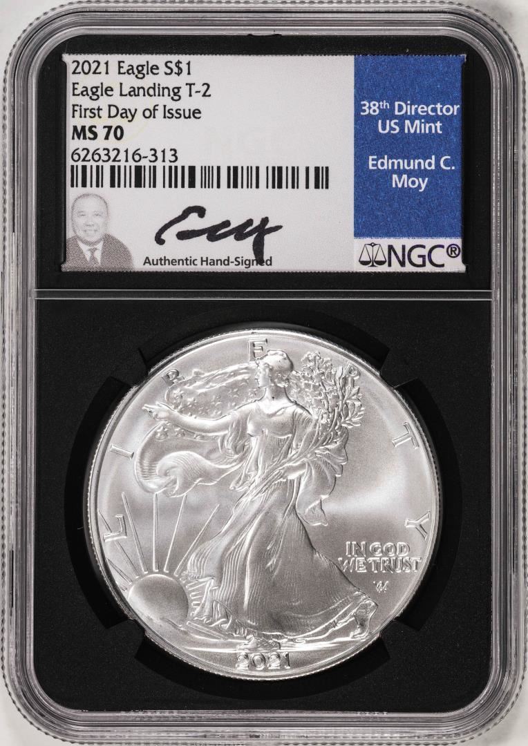 2021 Type 2 $1 American Silver Eagle Coin NGC MS70 FDOI Edmund Moy Signature