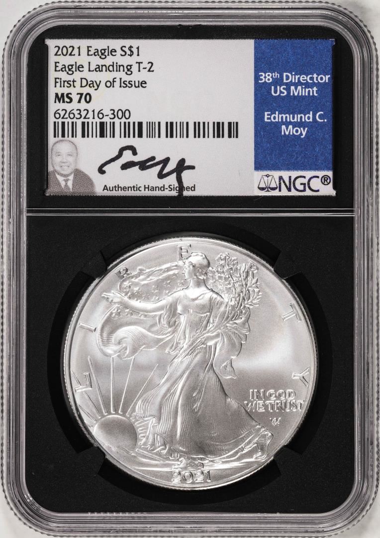 2021 Type 2 $1 American Silver Eagle Coin NGC MS70 FDOI Edmund Moy Signature