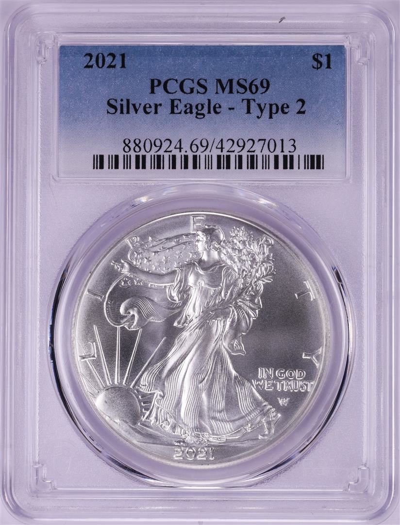 One 2021 Type 2 $1 American Silver Eagle Coin PCGS MS69.