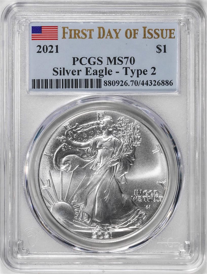 2021 Type 2 $1 American Silver Eagle Coin PCGS MS70 First Day of Issue