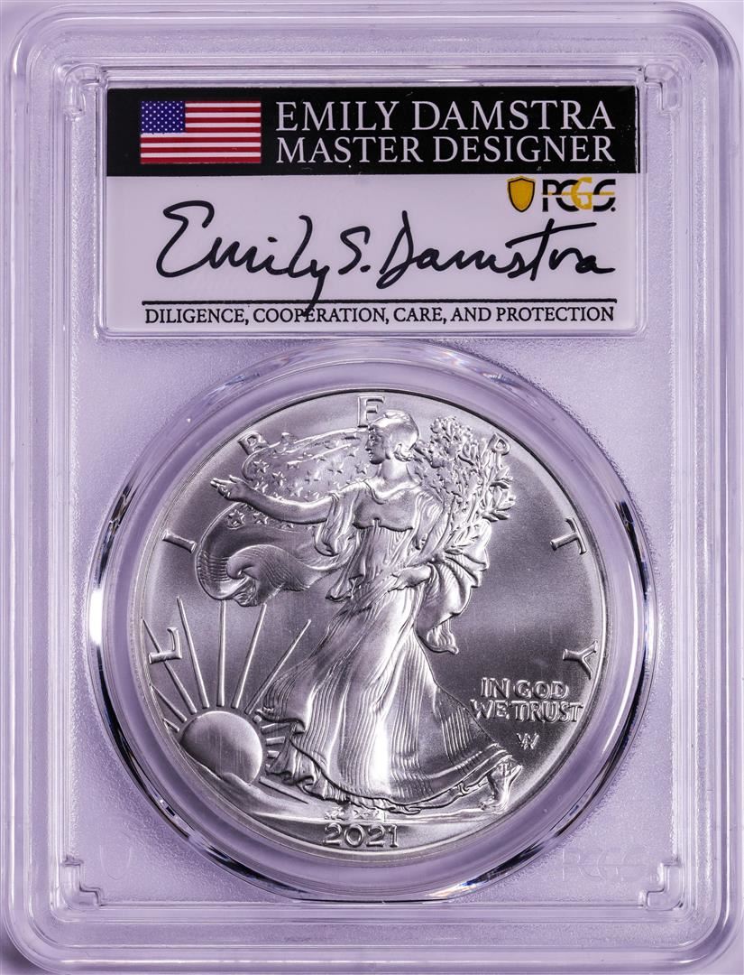 One 2021 Type 2 $1 American Silver Eagle Coin PCGS MS70 First Strike Damstra Signature. PCGS Graded.