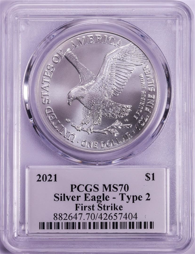 2021 Type 2 $1 American Silver Eagle Coin PCGS MS70 First Strike Damstra Signature