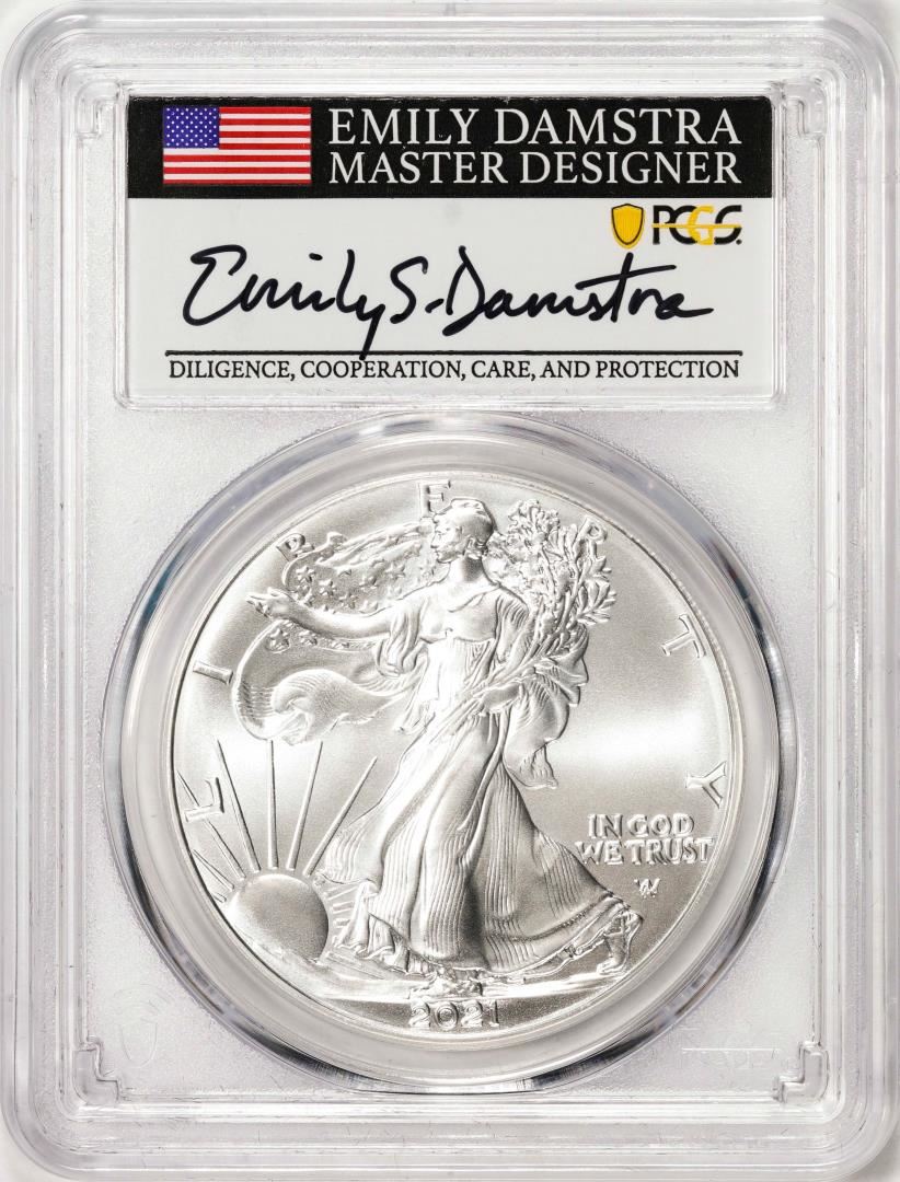 One 2021 Type 2 $1 American Silver Eagle Coin PCGS MS70 First Strike Damstra Signature. PCGS Graded.