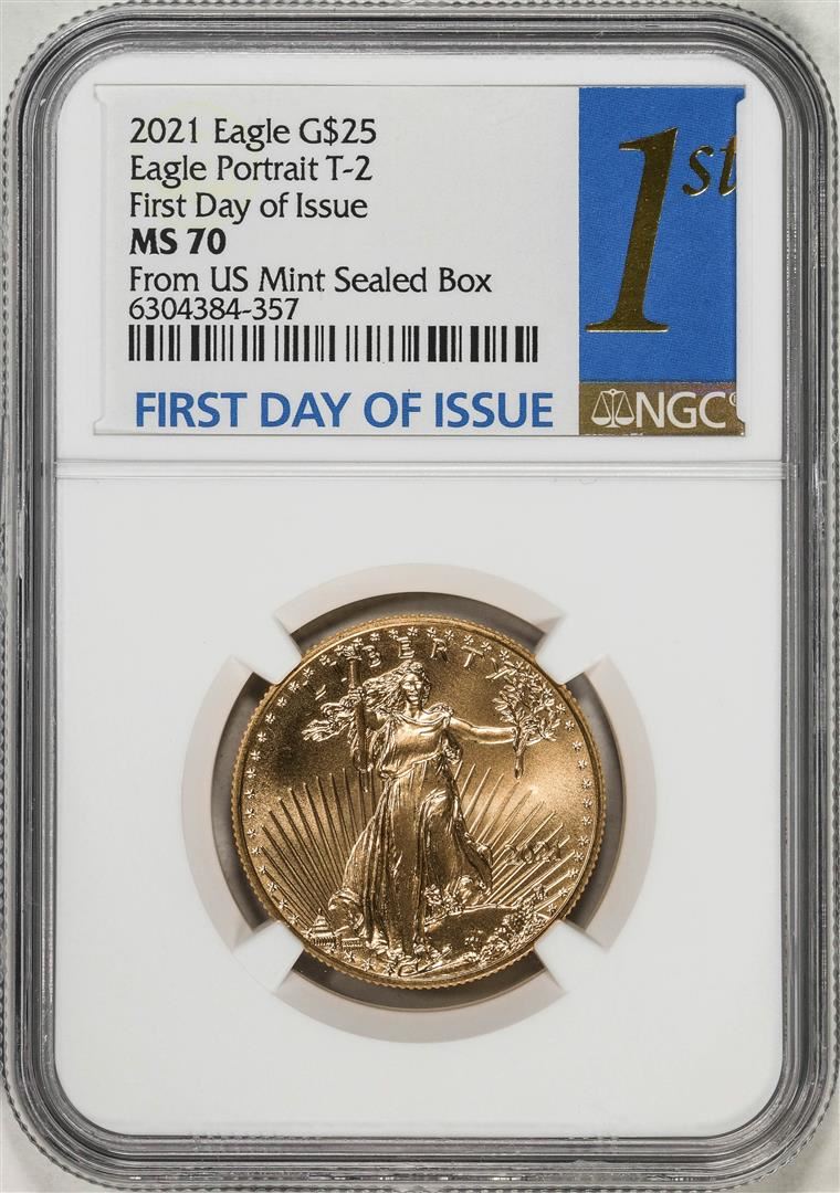 One 2021 Type 2 $25 American Gold Eagle Coin NGC MS70 First Day of Issue. NGC Certified.