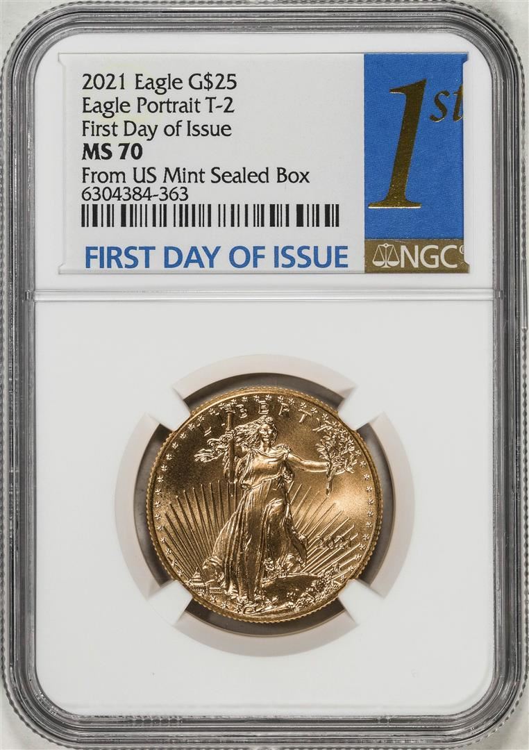 One 2021 Type 2 $25 American Gold Eagle Coin NGC MS70 First Day of Issue. NGC Certified.