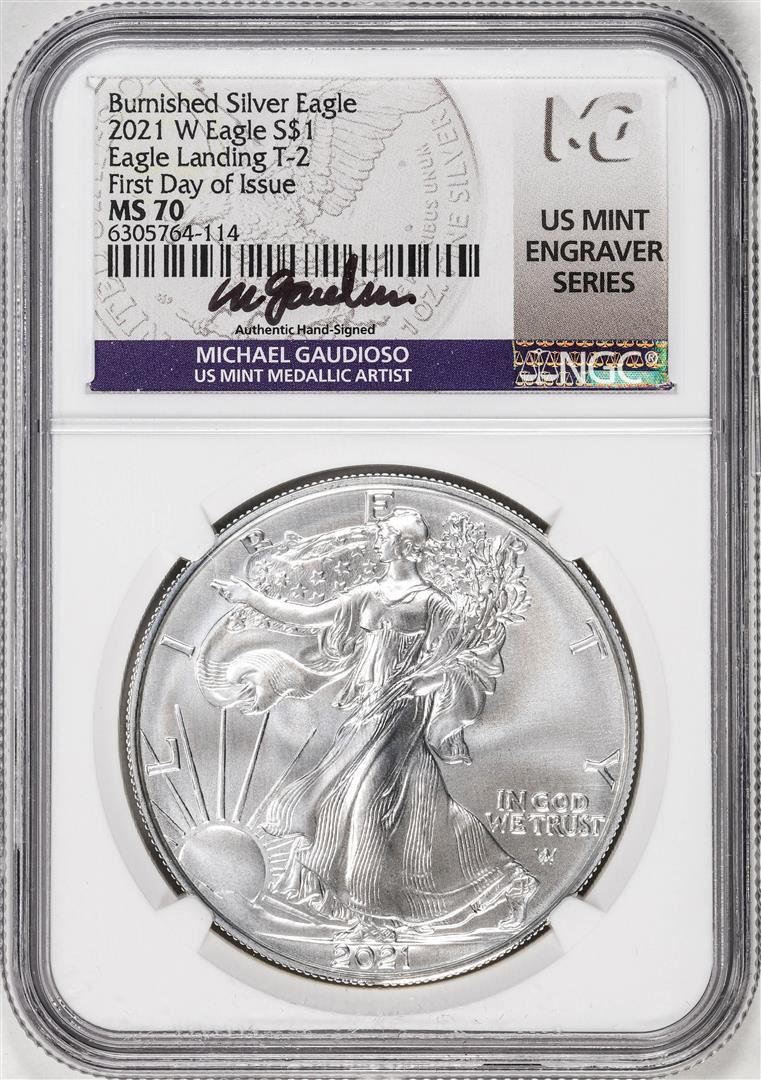 One 2021-W Type 2 $1 Burnished American Silver Eagle Coin NGC MS70 FDOI Gaudioso Signature. NGC Certified.