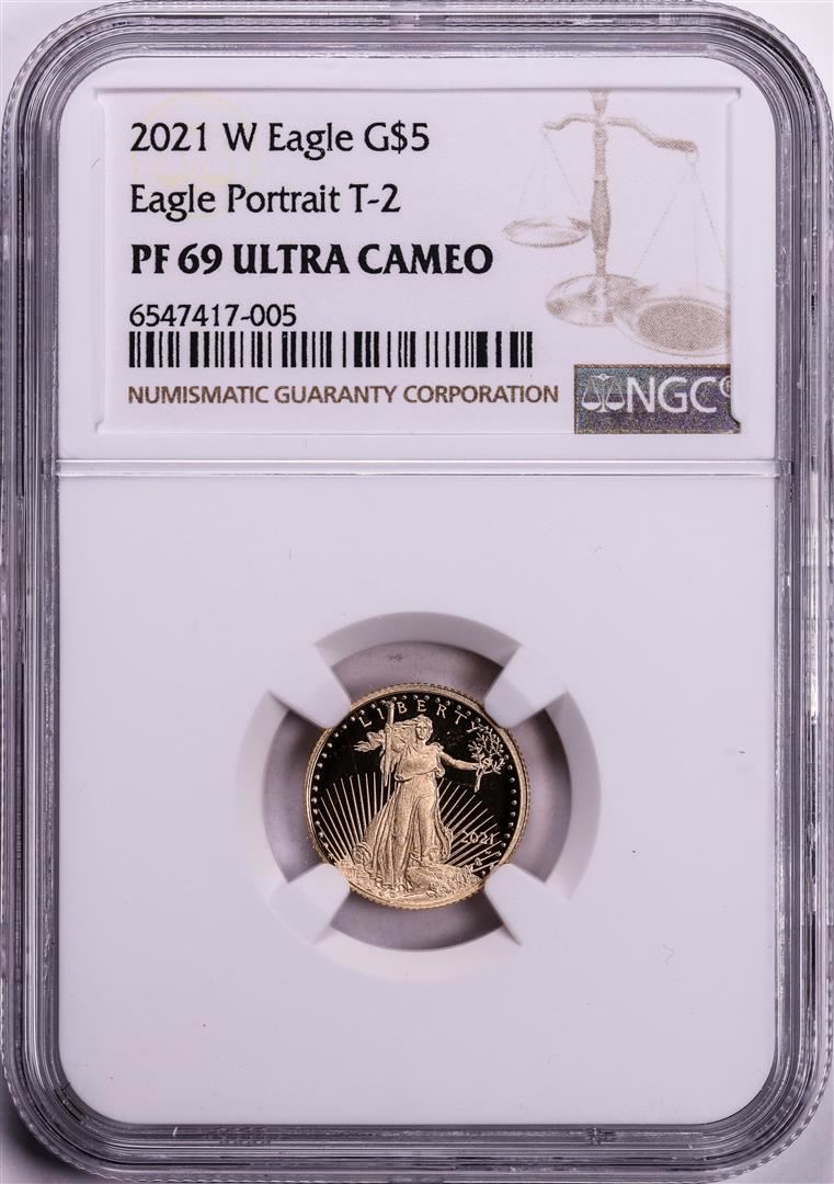 One 2021-W Type 2 $5 Proof American Gold Eagle Coin NGC PF69 Ultra Cameo. NGC Certified.