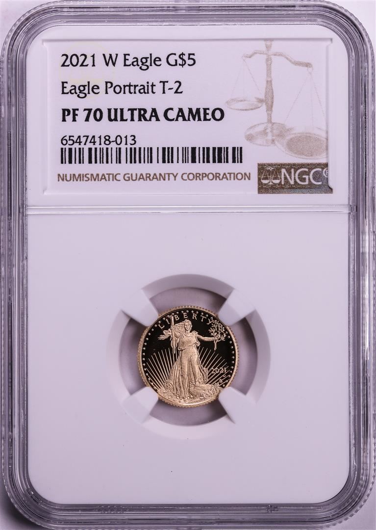 One 2021-W Type 2 $5 Proof American Gold Eagle Coin NGC PF70 Ultra Cameo. NGC Certified.