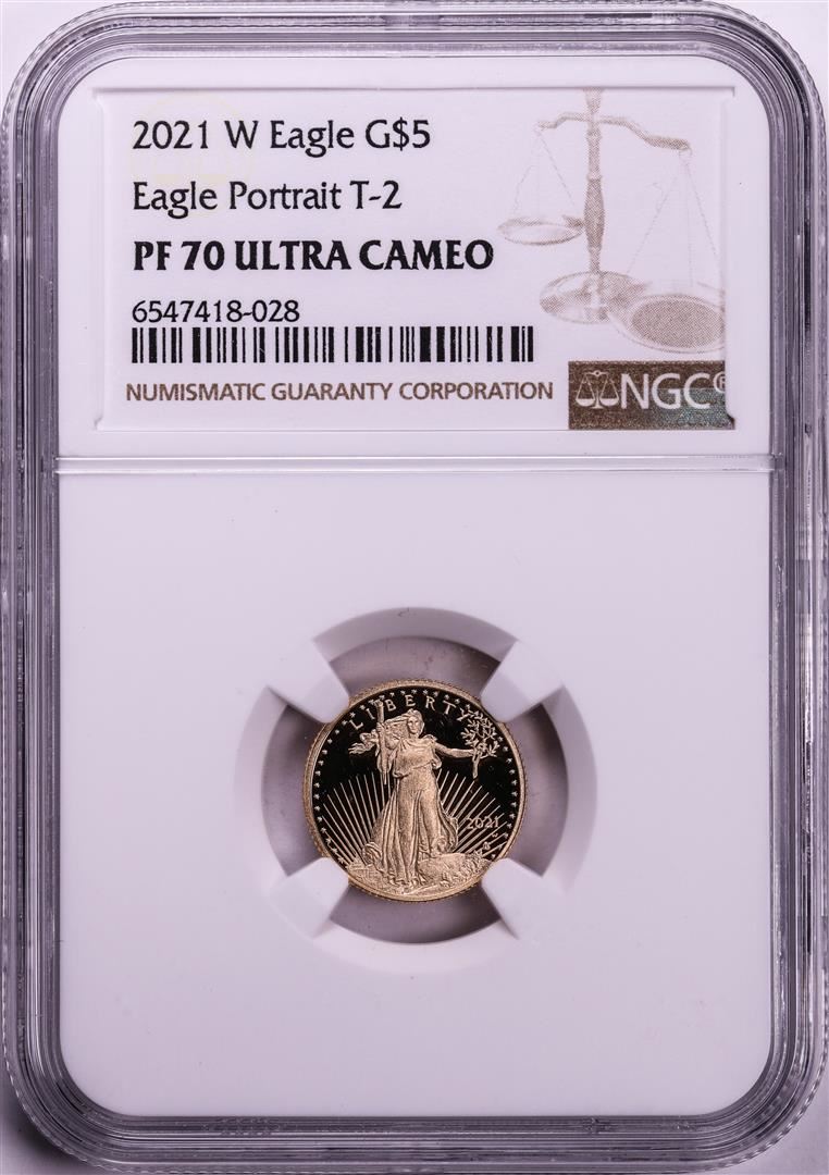 One 2021-W Type 2 $5 Proof American Gold Eagle Coin NGC PF70 Ultra Cameo. NGC Certified.