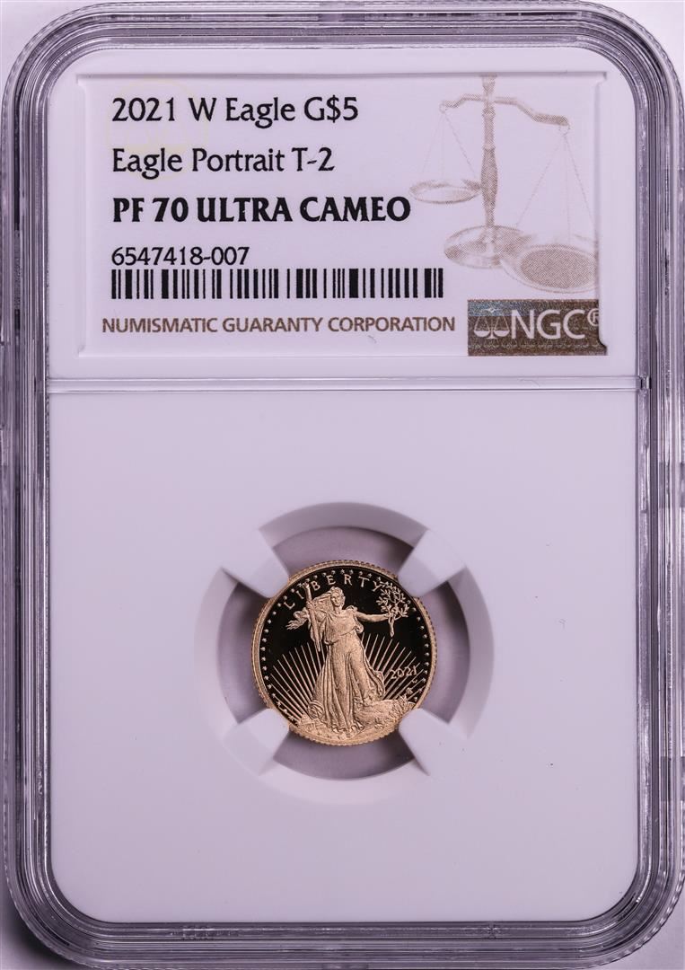 One 2021-W Type 2 $5 Proof American Gold Eagle Coin NGC PF70 Ultra Cameo. NGC Certified.