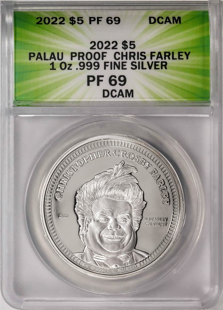 One 2022 $5 Palau Proof Chris Farley Silver Coin ANACS PF69DCAM. ANACS Certified.