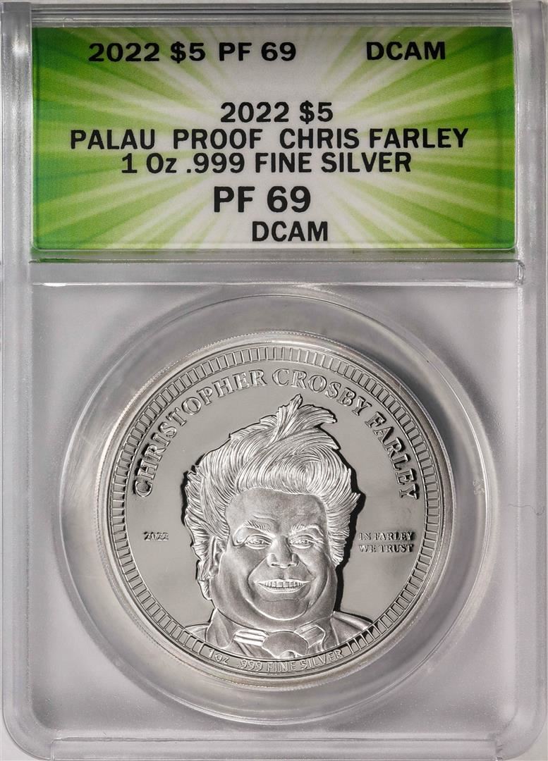 One 2022 $5 Palau Proof Chris Farley Silver Coin ANACS PF69DCAM. ANACS Certified.
