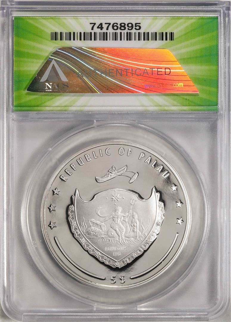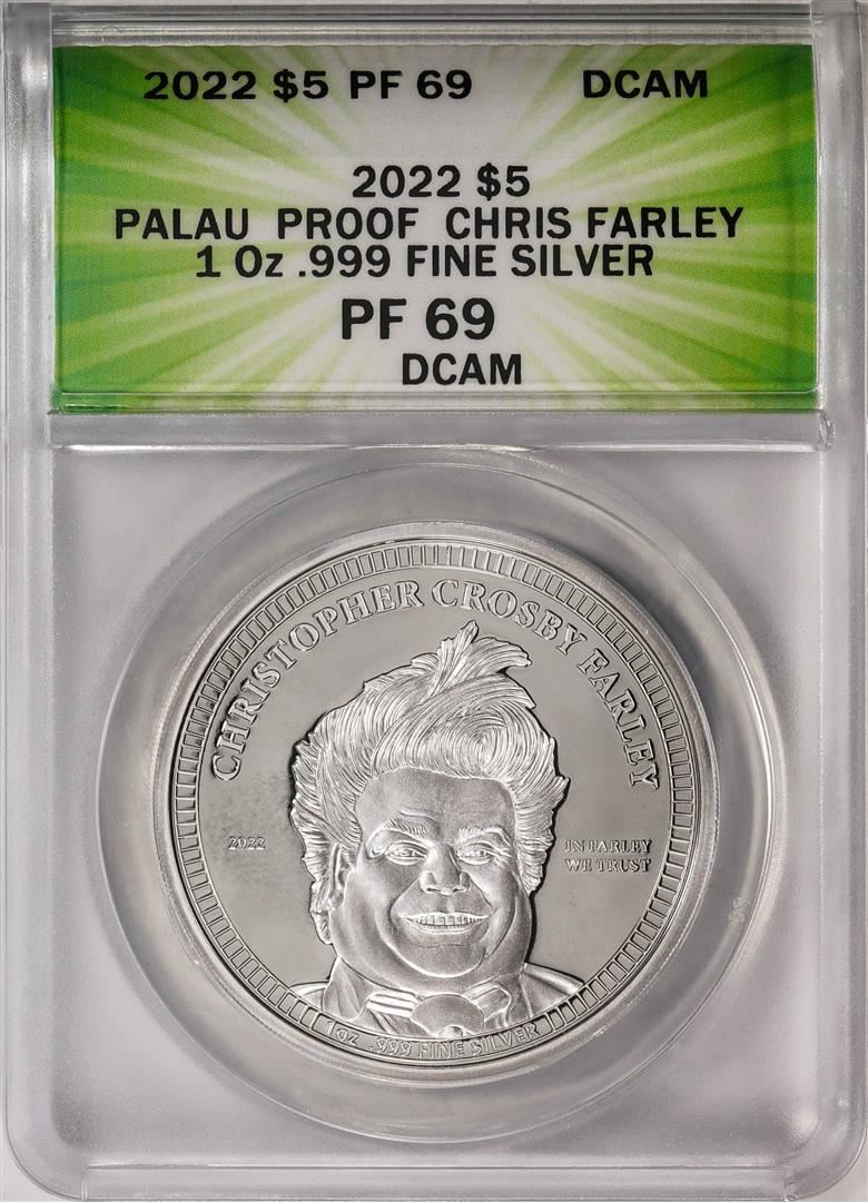 One 2022 $5 Palau Proof Chris Farley Silver Coin ANACS PF69DCAM. ANACS Certified.