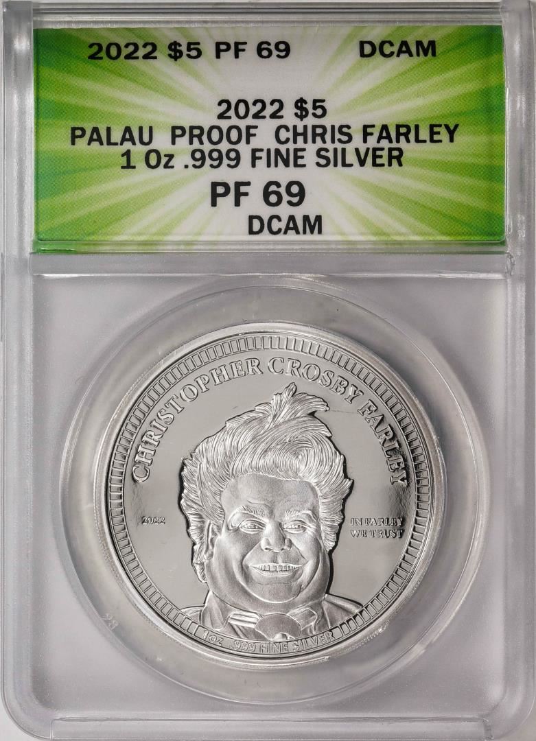 One 2022 $5 Palau Proof Chris Farley Silver Coin ANACS PF69DCAM. ANACS Certified.