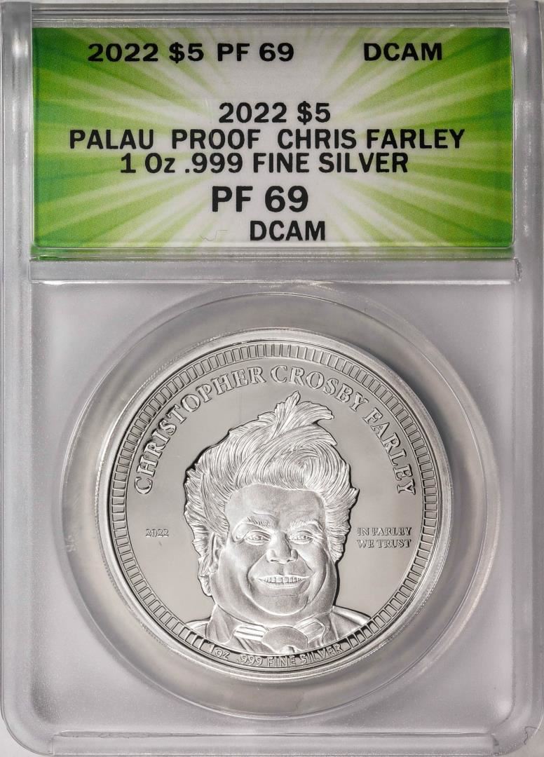 One 2022 $5 Palau Proof Chris Farley Silver Coin ANACS PF69DCAM. ANACS Certified.
