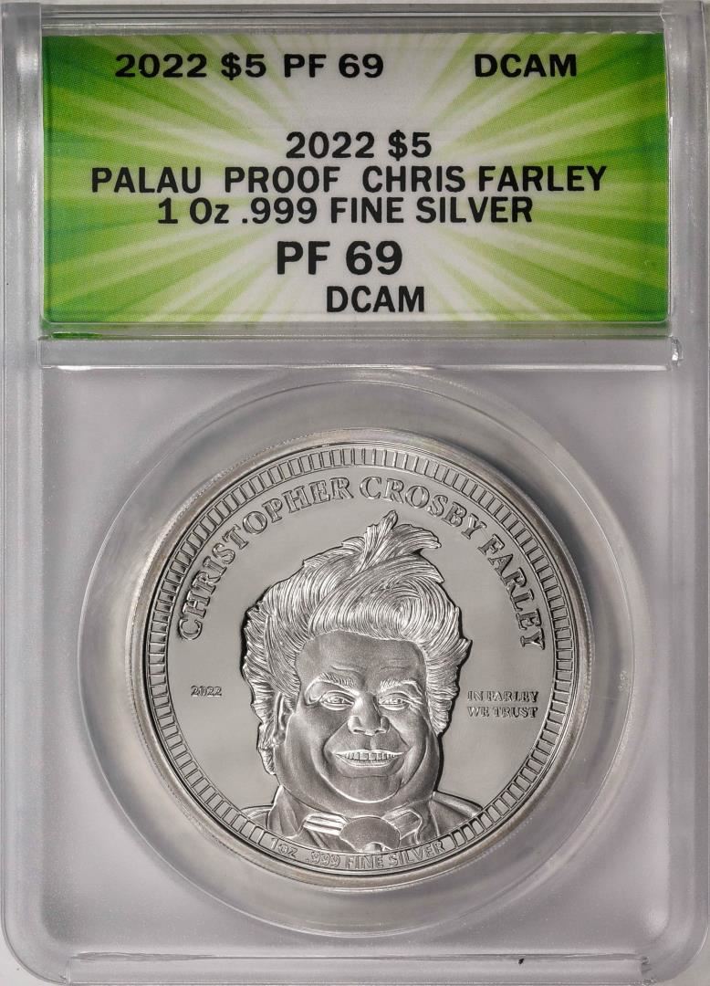 One 2022 $5 Palau Proof Chris Farley Silver Coin ANACS PF69DCAM. ANACS Certified.
