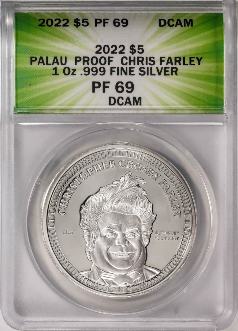One 2022 $5 Palau Proof Chris Farley Silver Coin ANACS PF69DCAM. ANACS Certified.