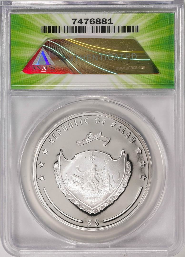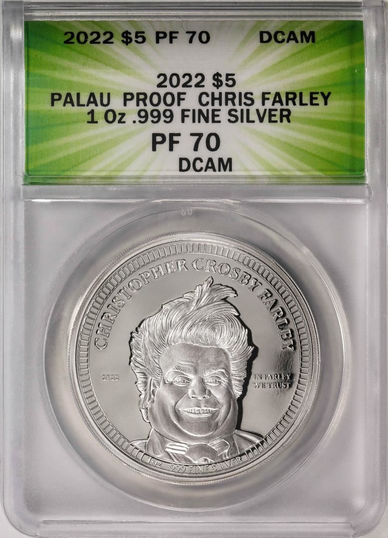 One 2022 $5 Palau Proof Chris Farley Silver Coin ANACS PF70DCAM. ANACS Certified.
