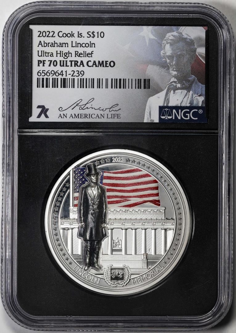 One 2022 Cook Islands $10 Abraham Lincoln Ultra High Relief Coin NGC PF70 Ultra Cameo. NGC Certified.