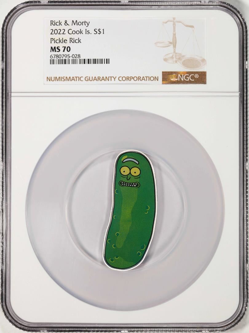 One 2022 Cooks Island $1 Rick & Morty Pickle Rick Silver Bar NGC MS70. NGC Certified.